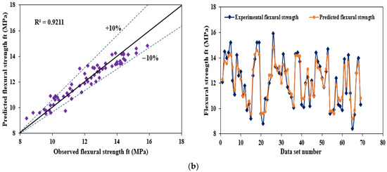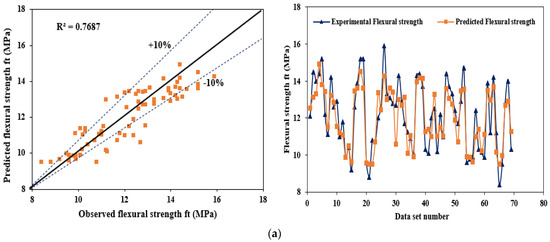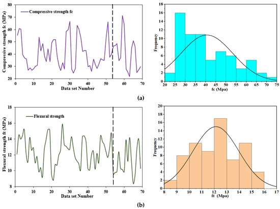 The variation and distribution in the strength of the most sensitive parameter and target parameter in the modeling task are depicted in Figure 14. As noted in Figure 14a,b, the flexural and compressive strength nearly follow normal distribution. Most of the datasets are within the superimposed curve, and the mean values are concentrated at the center of the curve, particularly for flexural strength data shown in Figure 14b, which reflect the lesser variation in the flexural strength dataset. The training data and testing data was separated with vertical dotted line, shown on the left side of Figure 14a,b.