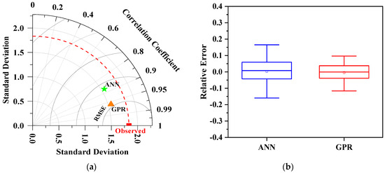 A Taylor diagram and box plot are presented in Figure 16 to compare the performance of the two models better. Taylor plots were used to show the prediction accuracy of the GPR and ANN models in a schematic approach. Three statistical parameters, including the correlation coefficient, RMSE, and standard deviations, were used to evaluate the degree of compliance among the actual and predicted flexural strength. The Taylor diagram (Figure 16a) shows that the GPR model has higher correlation and lower RMSE values than ANN, which confirms that the GPR model performs better than the ANN model.