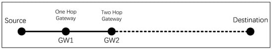 Each entry in the routing table includes the following information: the network address (NA) of the destination, path delay, path cost, Gateway (GW), two-hop gateway (GW2), GW Delay, and GW2 Delay. As shown in Figure 1, GW is the next-hop address from Source (S) to Destination, GW2 is the second-hop address from S to Destination (if it exists), and GW Delay and GW2 Delay represent the delay when S reaches nodes GW and GW2, respectively, in the route calculation process.
