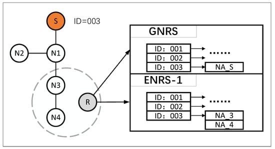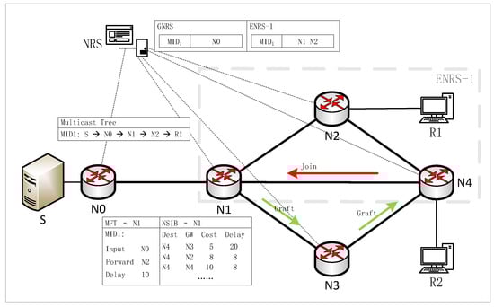 The root node (RN) of the multicast tree registers its information to the GNRS, while tree nodes (TN) within an enhanced resolution domain register their information to their respective Enhanced Name Resolution System (ENRS). As depicted in Figure 5, the left side illustrates a multicast tree with MID 3, comprising five tree nodes, including S and N1-N4, where S serves as the root node of the multicast tree. The table on the right offers a concise description of the entries within the resolution system. Root node S is registered in the GNRS, whereas the information of tree nodes N3 and N4 is recorded in Enhanced Name Resolution System 1 (ENRS-1). Each MID is associated with an NA List, which stores the network addresses NAi of node Ni.