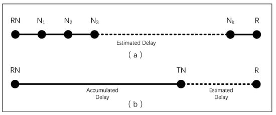 Before a receiver initiates a specific multicast group join request, it determines its QoS Delay Requirement (DQoS), specifying that the multicast transmission delay should be lower than this specified value. The multicast transmission delay is defined as the accumulated delay (Dest) of data transmitted from the multicast tree root to the receiver hop by hop, as shown in Figure 6a. For receivers (R) requesting to join a multicast group, the multicast delay can be divided into two parts: the delay from RN to TN (Daccum) and the delay from TN to R (Dest), as illustrated in Figure 6b.