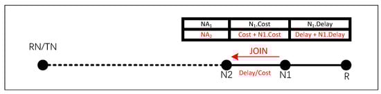 Upon receiving a JOIN message, nodes in the network calculate the accumulated delay and cost from their node to the Receiver Node using the LS Table, subsequently appending this information to the table. The specific construction process of the LS Table is depicted in Figure 7. Upon receiving the JOIN message forwarded by node N1, the non-tree node N2 parses the LS Table to retrieve the table length () and information about the tail node (N1). Subsequently, N2 looks up N1 in the NSIB and calculates the measured values Dmeas and Cmeas for delay and cost using Equations (4) and (5):