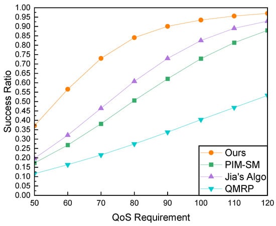 Based on the above test results, we observed that our method exhibits remarkable success ratios compared to other algorithms, particularly in scenarios with stringent delay constraints. Our approach comes at a higher cost than other algorithms. For instance, when the QoS requirement is set to 50 ms, the cost of our method is 71.8% higher than the average cost of other algorithms. However, our success rate is also 128.4% higher than the average success rate of other algorithms. In relaxed delay constraint scenarios, the cost of our method decreases significantly. This is because, when the search of JOIN message fails to find a path that meets the requirements, we choose lower-latency links to construct the path, resulting in higher costs.