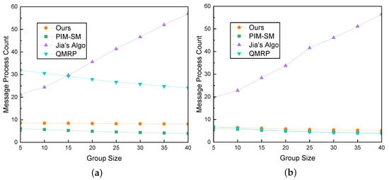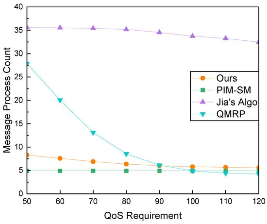 Under strict constraints, QMRP is more likely to trigger the search mechanism, resulting in many messages. Therefore, the significant difference in message processing overhead for QMRP under these two different constraints is evident. The message processing overhead of Jia’s algorithm increases significantly with the increase in group size. As the group size increases, the size of the multicast tree also expands, leading to a proportional increase in the required number of detection nodes for Jia’s Algorithm.
