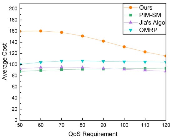 Finally, we examined the impact of delay constraints on network cost, as illustrated in Figure 15. Under strict constraints, our algorithm incurs higher network costs compared to others. However, with the relaxation of QoS constraints, our algorithm exhibits a substantial reduction in cost, whereas the cost variations in other algorithms are less pronounced. Combining this outcome with our earlier exploration of success ratios, it can be inferred that the higher costs in our algorithm primarily arise from the addition of links to the multicast tree that satisfy the relaxed delay constraints but come with higher associated network costs, which are not discovered by other algorithms. As the delay constraints are relaxed, paths with higher latency but lower costs become feasible for constructing multicast trees, leading to the observed reduction in network costs for our algorithm.