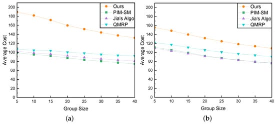 We further investigated the trend of network cost as group size changed, with delay constraints set to 50 ms and 100 ms, as depicted in Figure 16a,b. As the QoS constraint delay increased from 50 ms to 100 ms, our algorithm exhibited a significant reduction in cost, with costs gradually decreasing as the group member counts increased. Similar cost trends were observed in other algorithms, showing a gradual decrease. The increase in group size results in more multicast tree nodes distributed throughout the network, making it easier for routing algorithms to select tree nodes closer to the receivers. This contributes to the observed decrease in average cost. This outcome further substantiates the earlier inference. The primary objective of our algorithm is to meet the specified delay constraints. This drives our algorithm to seek paths characterized by lower latency, even if it results in higher costs. Upon the relaxation of constraints, it becomes apparent that paths with lower costs can still adhere to the stipulated delay constraints, resulting in a notable reduction in overall network cost. This further confirms our algorithm’s capability to intelligently select the optimal path based on different delay constraints.