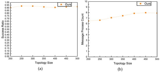 The impact of topology size on success ratio and message processing overhead. (a) Success Ratio; (b) Message Processing Overhead.