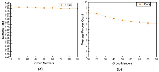 The impact of Group Member on success ratio and message processing overhead. (a) Success Ratio; (b) Message Processing Overhead.