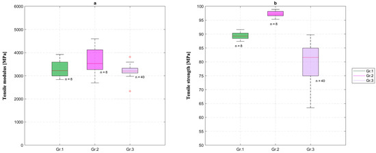 Distribution of (a) tensile modulus and (b) tensile strength of groups 1 to 3.