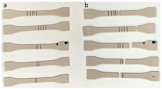 (a) The 3D-printed samples of subgroup 3.1; (b) fractured samples after tensile test.