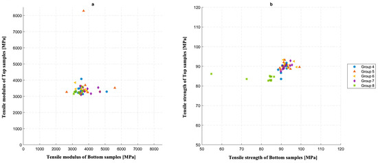 In addition, the differences between the top and bottom samples of each side of the pentagon towers did not show any significant differences (p-value = 0.26). Considering bottom and top samples of groups 4 to 8, two groups showed wider distribution of tensile modulus in bottom samples but were not significant (Figure 8). It showed that the height in Z-direction did not influence the reproducibility of the printing process.