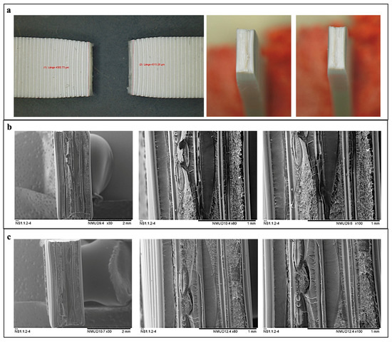 Visualization of both fracture sites of a sample using (a) light microscopy and (b,c) SEM.