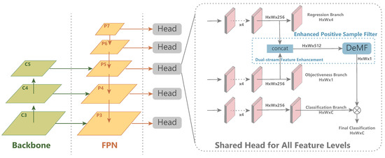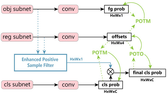 where I represents the input image and denotes the backbone network with FPN. The generated represents the set of predicted bounding boxes and corresponding classification probabilities . represents the shared detection head that consists of four components, i.e., , , and , which denotes the regression branch, objectiveness branch, classification branch and the proposed Enhanced Positive Sample Filter, respectively. They can be formulated as follows: