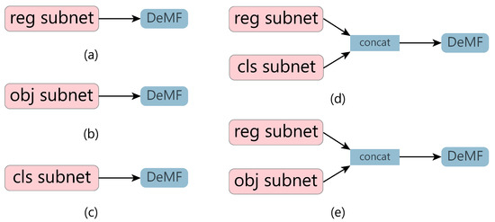 The (a–e) are diagrams of alternative architectures of DsFE module. The ‘reg subnet’, ‘cls subnet’ and ‘obj subnet’ mean the four convolutional layers on top of FPN feature maps in regression, classification and objectiveness branches, respectively.