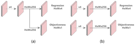 The (a) and (b) are diagrams of alternative architectures of objectiveness branch. The pink cubes represent convolutional layers.