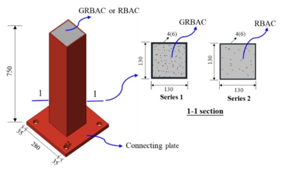 GRBAC and RBAC were prepared based on the mix design mentioned in Table 3 and Table 4. The prepared GRBAC and RBAC were cured under the conditions that the environmental temperature was about 20 ± 2 °C and the humidity was at least 95%, and the curation would last for 28 days. The prepared GRBAC or RBAC was carefully cast into steel tubes step by step and an electrical vibrator was used to ensure the compactness of GRBAC or RBAC during the casting process. All specimens were cured under natural conditions, then the high-strength epoxy mortar was used to fill and polish the surface of concrete before sealing the end. The steel tube was sprayed with red paint and plotted with white grid lines of 25 mm × 25 mm at the bottom region, aiming to facilitate the observation or capture of the damage phenomenon.