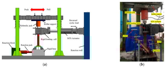 (a) Diagram of test setup of test setup for reversed cyclic loading; (b) specimen photograph of test setup for reversed cyclic loading.