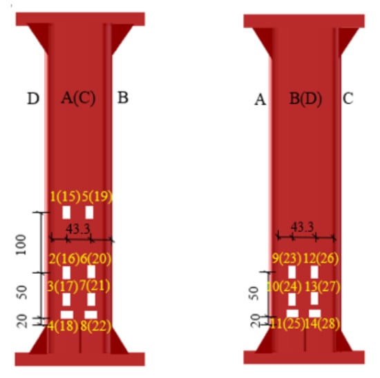 The tested specimen was connected to loading cell with a rigid steel plate and fixed to a rigid base with steel anchors and the rigid base was laterally supported with reaction jack and reaction pier to prevent horizontal sway during loading, as shown in Figure 2. The vertical load was applied through hydraulic jack before lateral cyclic loading and then remained constant. Reverse cyclic load was exerted by loading cell, which was connected to MTS actuator fixed on reaction wall. LVDTs were arranged along the height of specimen to record the deformation distribution, as shown in Figure 2b. To record the transverse strain of the outer steel tube, two strain gauges for each side were symmetrically pasted on the surface at the bottom of steel tube. Additionally, the development of the longitudinal strain of the outer steel tube was measured during test, and a total of 24 strain gauges were installed along the surface of steel tube. The layout of strain gauges was presented in Figure 3. Note that in Figure 3, it was specified that the surface far away from loading instrument was Side A, and the opposite surface was Side C. The other two sides were specified in clockwise direction.