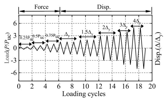 Figure 4 provided the loading history curve for the reversed cyclic load. Before yielding, the force-controlled loading history was adopted, with increment of 0.25 Puc, 0.5 Puc and 0.75 Puc (Puc is the calculated bearing capacity according to ATC-24 [46]), and each loading level was repeated two times. Then, a displacement-controlled loading protocol was used with history curve of ∆y, 1.5∆y, 2∆y, 3∆y, 4∆y, 5∆y…, where ∆y was the yielding displacement, defined as , and Ksec was the secant stiffness corresponding to 0.7 Puc. The first three displacement levels (∆y, 1.5∆y, 2∆y) were repeated three times, while the rest was repeated two times. The tested specimen was considered as failed when the bearing capacity degraded to less than 85% of the peak load or the column lost its integrity due to unfavorable serious deformation.