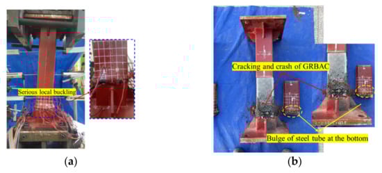 As mentioned above, all tested specimens exhibited similar failure process and overall failure modes, some differences were also found locally. To clearly demonstrate influence of different parameters, typical local failure for specimens were summarized and presented in Figure 6 and the detailed damage of inner concrete was demonstrated in Figure 7. The damage of GRBACFST columns occurred at the column bottom due to a larger bending moment. When a local bulge or buckling of the steel tube occurred, concrete adjacent to the buckled area was prone to crack under cyclic load, since the confinement effect from the steel tube was impaired. Therefore, the collapse of inner concrete always occurred at the region where serious local buckling of steel tube occurred. The bulge of the steel tube and crash of GRBAC were more serious under larger axial compression due to the P-Δ effect, demonstrated in Figure 6h and Figure 7h.