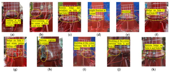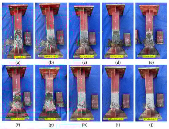 (a) Typical local failure of specimens for STG4-0-0.25; (b) typical local failure of specimens for STG4-0.3-0.25; (c) typical local failure of specimens for STG4-0.5-0.25; (d) typical local failure of specimens for STG4-0.7-0.25; (e) typical local failure of specimens for STG4-1-0.25; (f) typical local failure of specimens for STG6-0.5-0.25; (g) typical local failure of specimens for STG4-0.5-0.05; (h) typical local failure of specimens for STG4-0.5-0.5; (i) typical local failure of specimens for STM4-0-0.25; (j) typical local failure of specimens for STM4-0.5-0.25; (k) typical local failure of specimens for STM4-1-0.25.