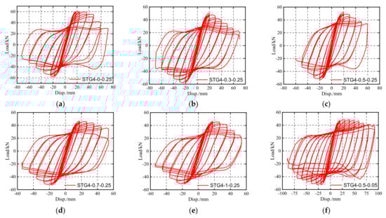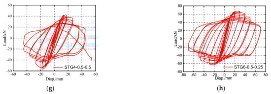 (a) Hysteresis curves for GRBACFST columns of STG4-0-0.25; (b) hysteresis curves for GRBACFST columns of STG4-0.3-0.25; (c) hysteresis curves for GRBACFST columns of STG4-0.5-0.25; (d) hysteresis curves for GRBACFST columns of STG4-0.7-0.25; (e) hysteresis curves for GRBACFST columns of STG4-1-0.25; (f) hysteresis curves for GRBACFST columns of STG4-0.5-0.05; (g) hysteresis curves for GRBACFST columns of STG4-0.5-0.25; (h) hysteresis curves for GRBACFST columns of STG4-0.5-0.5.