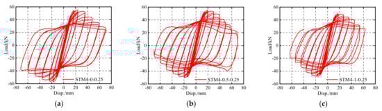 (a) Hysteresis curves for RBACFST columns of STM4-0-0.25; (b) hysteresis curves for RBACFST columns of STM4-0.5-0.25; (c) hysteresis curves for RBACFST columns of STM4-1-0.25.