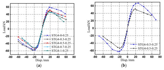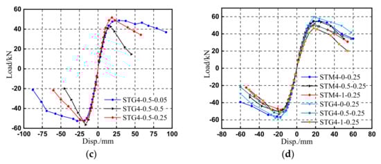 From Figure 10a and Table 5, it was clearly found that the peak load reduced with a higher replacement ratio of RBA, and compared with STG4-0-0.25, the bearing capacity of STG4-0.3-0.25, STG-0.5-0.25, STG4-0.7-0.25 and STG4-1-0.25 decreased by 9.48%, 11.25%, 16.92% and 17.68%, respectively. It was analyzed that due to the inherent flaw of RBA, the initial damage accumulated with the increase of RBA replacement ratio, and the negative effect caused by the inherent flaw became influential, leading to a more negative effect on the bearing capacity. Moreover, the difference in the failure mode was more evident since the confinement effect was weakened once yielding of the steel tube occurred. In Figure 10b, the increase of the steel tube thickness was beneficial for the initial stiffness and the peak load, while it had little influence on the degradation in behavior. The reason for this was that in the degrading stage, the confinement from steel tube was no longer effective due to the bulge of the steel tube. The bearing capacity of STG6-0.5-0.25 was increased by 23.98% compared with STG4-0.5-0.25, since a thicker steel tube provided better confinement to inner concrete, which in return provided favorable lateral support for the steel tube to prevent premature buckling under a small load. In Figure 10c, the influence on the bearing capacity was insignificant when the axial compression ratio was less than 0.25. The degradation in resistance of GRBACFST column was gentler under a small axial compression ratio. The applied axial load would result in a more serious P-Δ effect with a higher axial compression, leading to premature yielding or bulging of the steel tube; moreover, the inner concrete was also more prone to crack and crash. As in Figure 10d, it was concluded that the bearing capacity of composite columns was close when the only variable was cementitious material, while specimens GRBACFST columns always developed a relatively higher bearing capacity than specimens RBACFST columns. The result was comparable to the result in reference [47], and it was considered that the finer compactness of concrete was achieved during the hydration reaction with geopolymers.