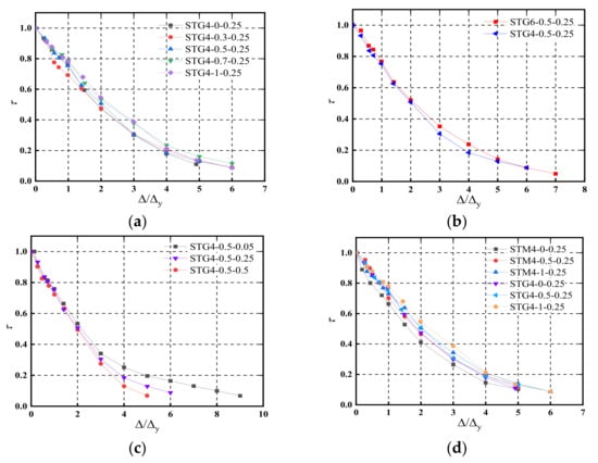 (a) Stiffness degradation coefficient curve τ-∆/∆y for different replacement ratios of RBA; (b) stiffness degradation coefficient curve τ-∆/∆y for different steel tube thicknesses; (c) stiffness degradation coefficient curve τ-∆/∆y for different axial compression ratios; (d) stiffness degradation coefficient curve τ-∆/∆y for different cementitious materials.