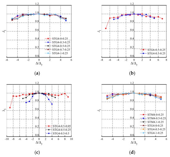 (a) Strength degradation coefficient curve λj-∆/∆y for different replacement ratios of RBA; (b) strength degradation coefficient curve λj-∆/∆y for different steel tube thicknesses; (c) strength degradation coefficient curve λj-∆/∆y for different axial compression ratios; (d) strength degradation coefficient curve λj-∆/∆y for different cementitious materials.