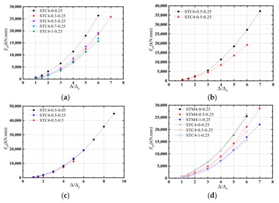 The influence of different parameters on the energy dissipation behavior is demonstrated in Figure 13. The energy dissipation capacities for tested specimens were similar during the initial stage (∆/∆y less than 2.0). The incorporation of RBA had a negative effect on the energy dissipation (as in Figure 13a), mainly due to the reduction in bearing capacity. However, the increase of RBA replacement ratio did not impact the energy dissipation a lot. From Figure 13b, specimen STC6-0.5-0.25 exhibited higher energy dissipation capacity than STC4-0.5-0.25 and the ultimate displacement was also larger. This was because the bearing capacity and deformation capacity were enhanced, owing to better confinement effect from a thicker steel tube. The effect of the axial compression ratio on the energy dissipation behavior was not significant when the axial compression ratio was small. However, a larger axial compression ratio might reduce the energy dissipation capacity, since it resulted in more serious degradation in bearing capacity. In Figure 13d, it was concluded that the replacement of OPC with geopolymer did not affect the energy dissipation behavior, which was mainly determined by the plastic behavior of the proposed columns.
