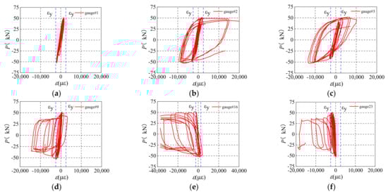(a) P-εy hysteresis curve for STG4-0.5-0.25 of gauge#1; (b) P-εy hysteresis curve for STG4-0.5-0.25 of gauge#2; (c) P-εy hysteresis curve for STG4-0.5-0.25 of gauge#3; (d) P-εy hysteresis curve for STG4-0.5-0.25 of gauge#9; (e) P-εy hysteresis curve for STG4-0.5-0.25 of gauge#16; (f) P-εy hysteresis curve for STG4-0.5-0.25 of gauge#23.