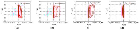 (a) P-εx hysteresis curve for STG4-0.5-0.25 of gauge#8; (b) P-εx hysteresis curve for STG4-0.5-0.25 of gauge#14; (c) P-εx hysteresis curve for STG4-0.5-0.25 of gauge#22; (d) P-εx hysteresis curve for STG4-0.5-0.25 of gauge#28.