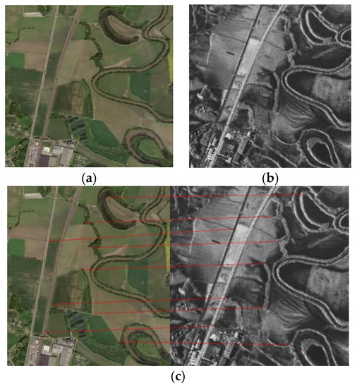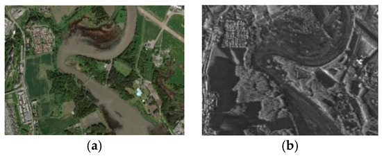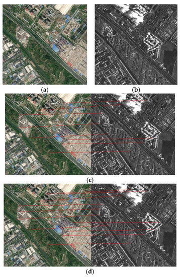 With the rapid development of remote sensing technology, the acquisition methods of remote sensing images are gradually showing a diversified trend. In practical applications, the imaging methods of heterogeneous remote sensing images are different and the information contained is not the same. How to use heterogeneous remote sensing for effective fusion and complementation of information in images has attracted more and more attention in recent years. Synthetic Aperture Radar (SAR), as an active imaging radar, has the advantages of all-weather imaging due to its strong penetrating ability [8,9,10]. It can penetrate clouds and haze and other occlusions to break through the limitations of optical imaging, but is not easy to obtain the perceived characteristics of ground targets. In contrast, optical remote sensing images can obtain spectral information such as rich gray-scale textures of ground targets under good imaging conditions, good visual interpretation functions and have great advantages in ground target recognition and classification. Therefore, it has become an important research topic in the field of remote sensing image processing to realize the complementary advantages of multi-source images through effective heterogeneous remote sensing image registration and fusion technology [11]. At present, due to the great difference in imaging mechanism between SAR and optical images, the geometric and radiation characteristics of the images are different. In addition, the multiplicative speckle noise inherent in the SAR image brings many difficulties to the registration of SAR and optical images. Therefore, it is of great significance to study the registration of SAR and optical images.