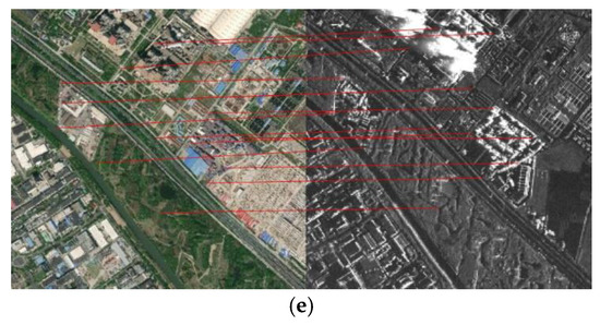 (a) Optical image; (b) SAR image; matches found in pair 1 using (c) SIFT, (d) SAR-SIFT, and (e) the proposed method. The reference image is shown on the left and the sensed image on the right.
