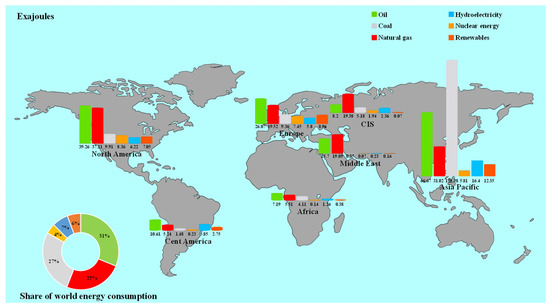 In 2021, British Petroleum (BP) released the 2021 World Energy Statistics Yearbook, in which non-renewable resources, such as oil, natural gas, and coal, accounted for an extremely high proportion of energy consumption around the world, reaching 83%. Even in recent years, the whole world has emphasized energy saving and emission reduction, and put forward related concepts such as “carbon neutrality” and “carbon peaking” to reduce carbon emissions [1,2] The consumption of renewable resources, such as wind and solar energy, has reached a historical peak and only accounts for 6% of the total consumption. Figure 1 shows the proportion of energy consumption in all continents and regions of the world [3].