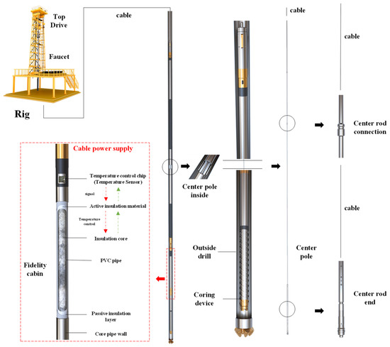 To find out the laws of the Earth’s oil and gas resource storage, it is necessary to overcome the influence of changes in the in situ sample temperature and other occurrences in the environment on the in situ properties of the rock during the coring process [13]. However, the extreme environment and complicated working conditions deep underground make it extremely difficult to achieve power and data transmission at the bottom of the hole, making it extremely difficult to achieve core temperature fidelity [9].