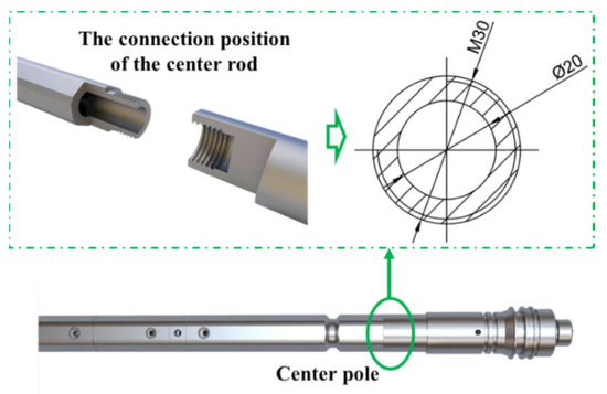 The center pole is formed by connecting multiple sections of slender poles, and the interface at the connecting position is a circular ring with an outer diameter of 30 mm and an inner diameter of 20 mm, as shown in Figure 7. The center pole is small in size and compact in structure.