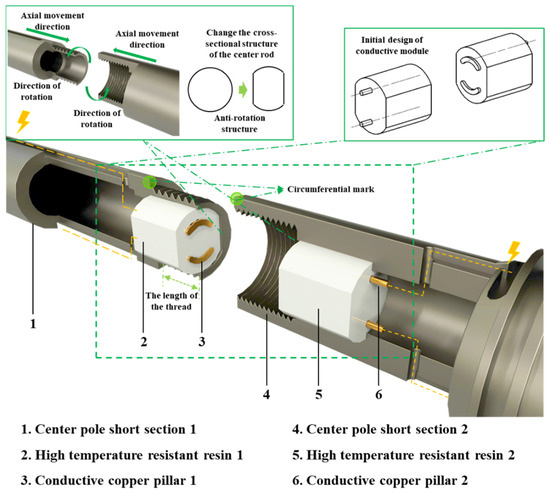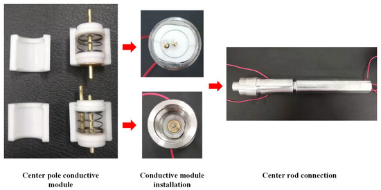 By arranging wires in the center pole, electrical energy is provided for the heating system at the bottom of the hole, realizing active insulation and core removal in situ. One of the main difficulties is to realize the electrical conduction at the connection position. The conductive process is shown in Figure 6.