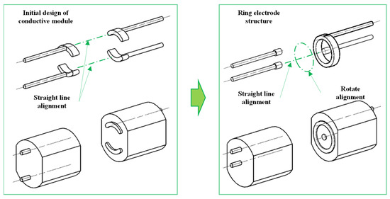 The solution to spatial separation includes 10 principles of invention. To solve the problem of electrode alignment in the conductive module, the invention principle seven “nesting” and the invention principle 17 “space dimension change” can be used. “Nesting” refers to embedding an object in another object or allowing something to pass through the cavity of another object. “Space dimensionality change” refers to changing one-dimensional linear motion into two-dimensional plane motion or three-dimensional space motion. With the help of these two principles, and considering the rotational movement of the conductive module, the electrode can be designed as a combination of a ring and a dot. The dot-shaped electrode is placed in the center of the circular ring electrode, and the electrode at the other end is the dot-shaped electrode at the corresponding position, which avoids the problem that the two electrodes cannot be aligned due to the rotational movement. The structure before and after the improvement is shown in Figure 11.