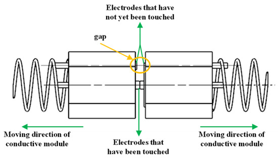 Due to the insufficient contact or excessive squeezing of the conductive module, this object–field model belongs to the ineffective complete model and the harmful complete model. According to the general solution of the object–field model, the useful effect can be improved by adding another substance S3 and another field F2. Considering that the degree of electrode contact can be adjusted by itself, a spring that can provide a telescopic function is introduced as S3, and the elastic force field is F2. The improved object–field model of the conductive module is shown in Figure 13.