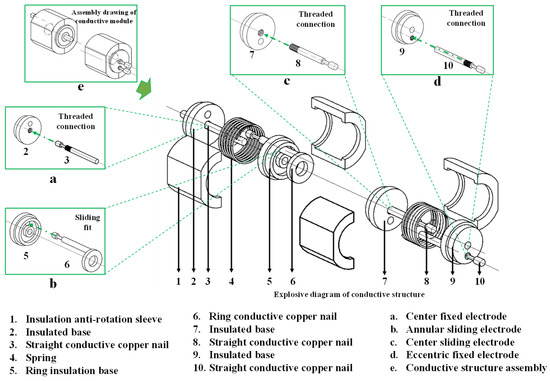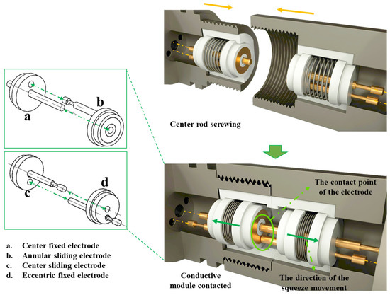 By adding a spring mechanism between the center pole and the conductive module, the adaptive adjustment of the electrode contact is realized. The conductive center pole is shown in Figure 15. The space and positioning structure for placing the spring mechanism are designed inside the center pole, the spring is installed on the positioning structure, and the conductive module is placed on the spring. During the screwing process of the center pole, the two electrodes always remain aligned. A certain length of spring is selected to provide the initial pre-pressure to ensure contact, and after the screwing is completed, the position of the two electrodes is automatically adjusted by the compression spring to make them fully squeeze in contact without excessive squeezing, ensuring the safe conduction of electricity.