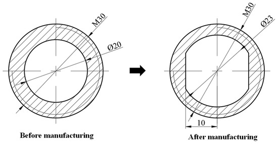 However, whether the electrode can contact is still related to the circumferential calibration position of the center pole, that is, the angle of rotation of the center pole, so A21 is still 1. It can be judged by the independent axiom that the improved matrix B is still a coupling matrix, and the design scheme still needs to be improved. Since the contact of the conductive module is related to the screwing angle of the center pole and the thread wear condition, when the center pole is completely screwed, it may cause insufficient contact or excessive squeeze. The object–field model between the center pole and the conductive module can be established for analysis, as shown in Figure 12. S1 represents the conductive module, S2 represents the center pole, and F1 represents the electrical conduction.