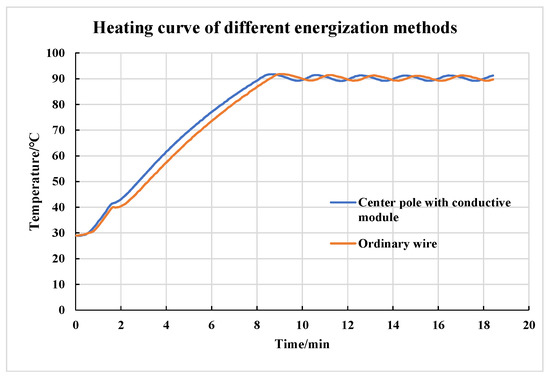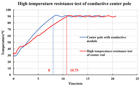 The results of the high-temperature-resistance test of the conductive center pole are shown in Figure 27. Heating the same thermal oil to 90 °C took 2 min and 45 s longer in a high-temperature environment than at room temperature, taking 10 min and 45 s in total. On the one hand, it is considered that due to the increase in temperature, the resistance of the wires in the center pole increases, and the loss of power consumption increases. On the other hand, the uniformity of the temperature distribution of the thermal oil is poor, and the position of the temperature sensor has great influence on its readings, which ultimately makes the heating curve of the two environments different.