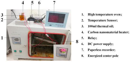 A conductive center pole and a conventional wire were used to power the carbon nano-material heater and heat the thermal oil, respectively, to compare its electrothermal conversion efficiency. The experimental platform is shown in Figure 23.