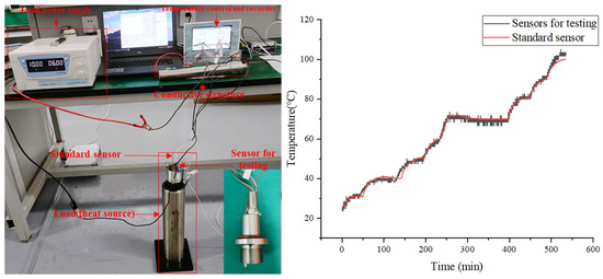 In addition, the signal transmission performance of the conductive central rod was verified by experiments. First, the signal transmission of the PT100 temperature sensor was tested. The temperature sensor was connected in series with the conductive central rod, and the heat conducting oil was used as the object of temperature measurement. The different temperatures of the heat conducting oil at different times were measured and recorded. The experimental results are shown in Figure 29. The temperatures measured by the temperature sensor in series with the conductive central rod and the standard temperature sensor have a high consistency. Due to the different placement positions of the sensors, the measured temperatures have slight differences, but basically meet the engineering application requirements.