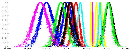For any variable, the corresponding function value can be obtained through numerical integration. When the number of cloud drops is cloud drops, the time parzen method can be used to estimate the probability density function. Consequently, the probability density function of the cloud model at that time H e = 0 can be expressed as follows.
