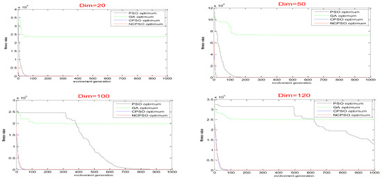 In order to verify the feasibility of the hybrid PSO algorithms, we applied the following functions to carry out a series of simulation experiments. Based on the above analysis, we used the same test function such as Rosenbrock and different hybrid PSO algorithms. In addition, the experimental results with the best performance of the same test function are described in Figure 6, Figure 7, Figure 8, Figure 9 and Figure 10 as follows.