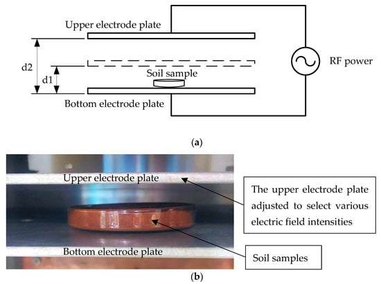 Schematic diagram of RF heating system: (a) Soil samples used for radio frequency heating system. (b) Radio frequency heating system.