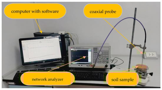 The process of calibrating the network analyzer involved using air, a shot probe, and deionized water, as recommended in [28]. The calibrations and measurements were conducted in a closed laboratory setting with a temperature of 25 °C. The soil samples were measured on site within a frequency range of 20 MHz to 10 GHz, utilizing a VNA configured with a total of 1001 sampling points. This frequency range is relevant for industrial, scientific, and medical applications [24,25]. The soil samples were placed in a container that was wide enough to allow the probe to be inserted and the soil sample was thick enough to prevent any reflection coefficient interference from the glass dish and ground floor on the measurements and errors in the measurement of the dielectric properties. A dielectric slim form probe was used to measure the dielectric properties of the soil samples in situ. The dielectric properties values were measured with three replications, as suggested in [29], and the mean values were used for data analysis. The setup for measuring dielectric properties is depicted in Figure 3.